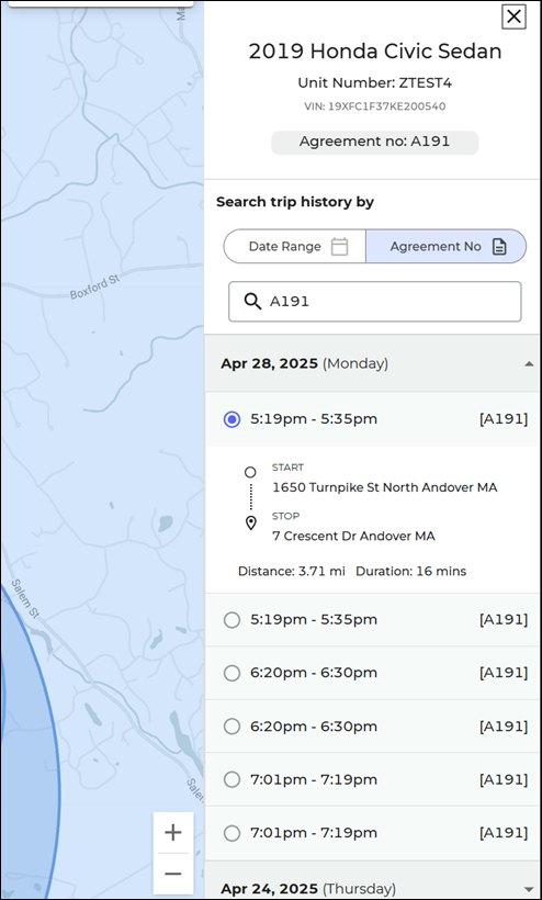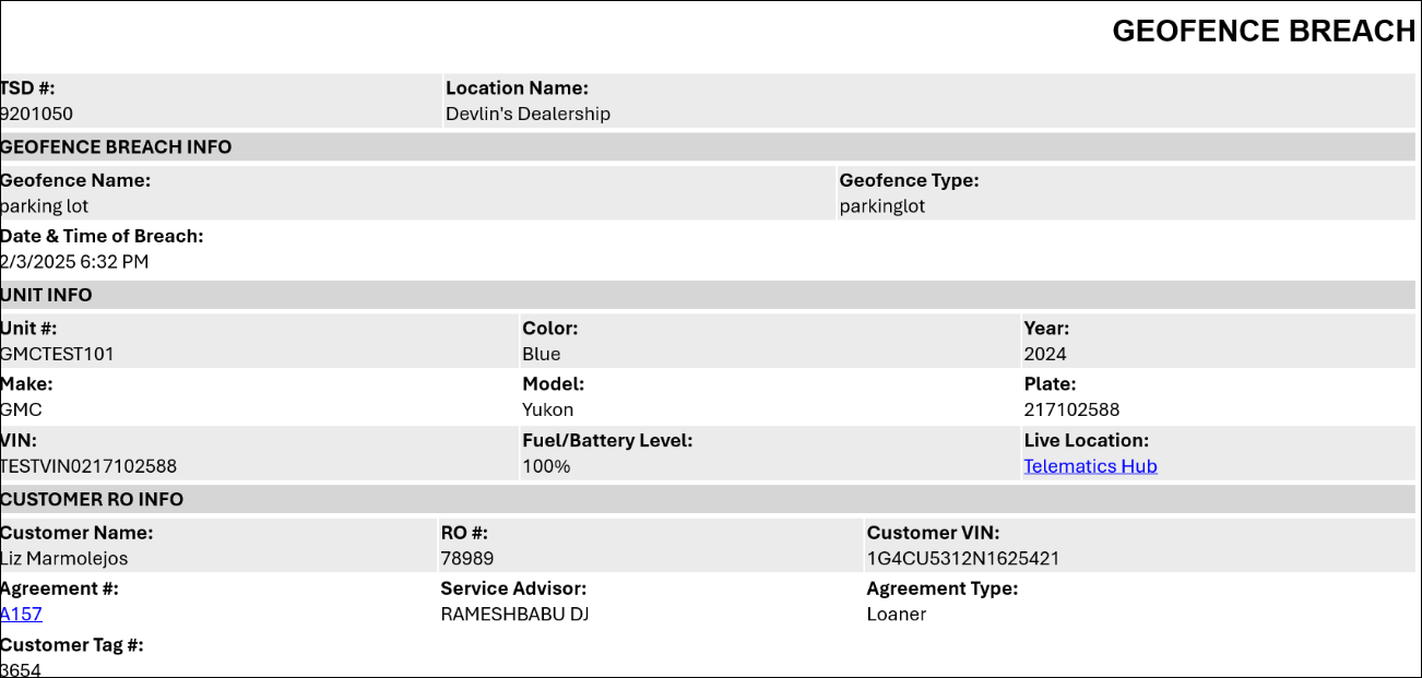 • Geofence alerts: Vehicle Out, Vehicle In, and Parking Lot geofence breaches (while on an agreement).