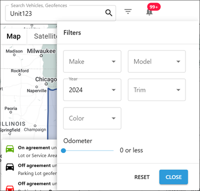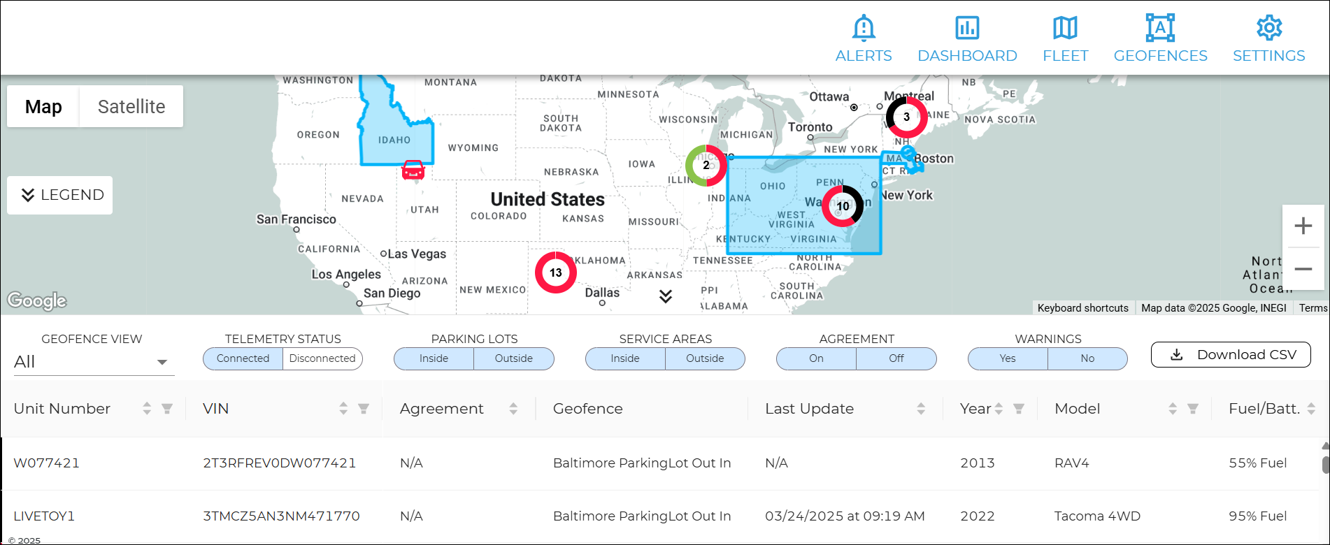 • filter the grid to narrow your view by geofences, telemetry status (connected or disconnected vehicles), vehicles inside or outside Parking Lots and/or Service Areas, vehicles on or off agreements, and/or vehicles with warnings