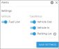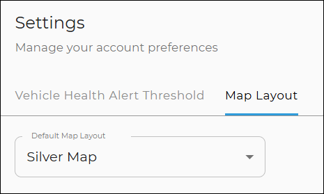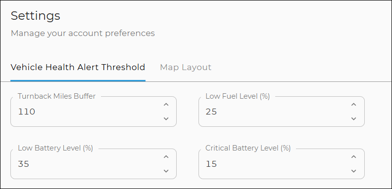 • Settings lets you define vehicle health alert thresholds, which determine when alerts are generated, as well as map layout. For example, set Low Fuel to 30% if you want an alert when a vehicle’s fuel is 30% full or less.