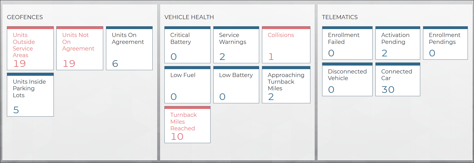 View a breakdown of geofences, vehicle health alerts, and telematics connectivity statuses. Click a card to access those vehicles on the Fleet map.