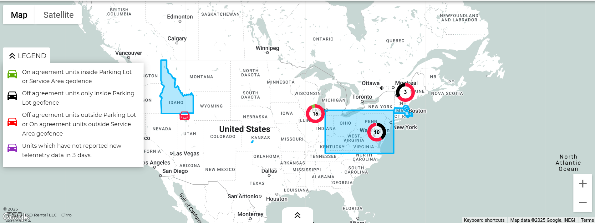 • expand the legend to understand the Hub's color-coding system for vehicle statuses (green for units currently on an agreement inside your parking lot or service area; black for sitting units inside your parking lot; red for sitting units outside your parking lot or service area; purple for units not reporting telemetry data in the last 3 days).