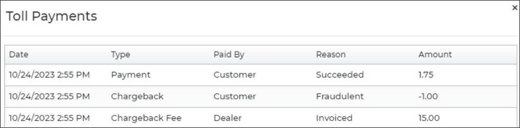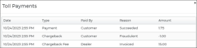 6. Note: If the customer disputes the charge and it results in a chargeback, the chargeback is added to the Toll Payment History (Payment Reversed), as well as the Chargeback Fee (paid by Dealer, without a reason, since no payment was made).