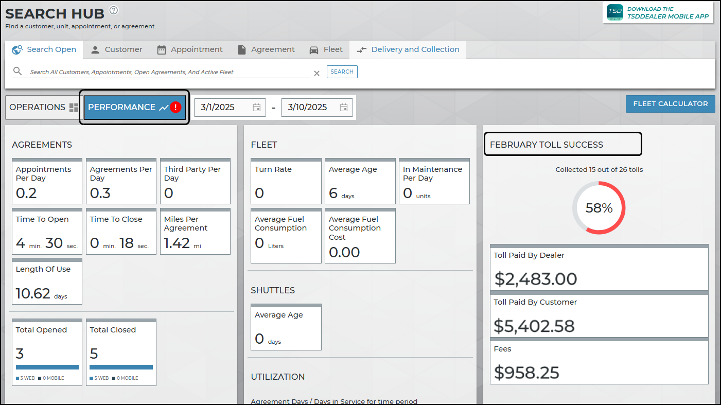 When your location's toll success rate is at or below the threshold (set by TSD, behind-the-scenes), a red alert icon will be present on the Performance button, so you know review is needed.
