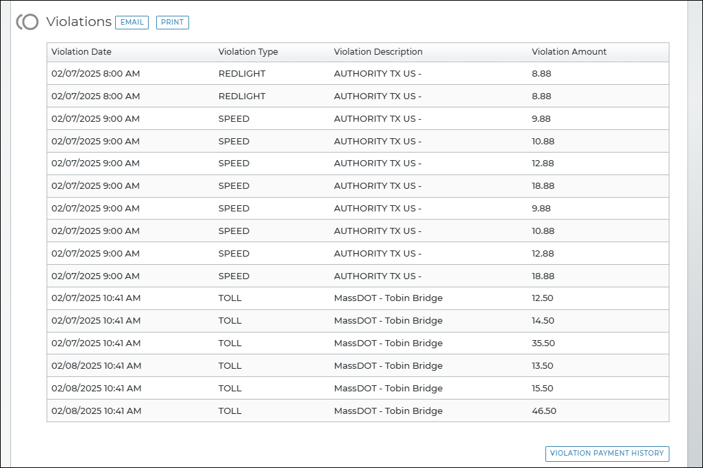 • Violations Summary Report. Run the Violations Summary to view and export last month's violations invoiced to your location and your customers, as well as chargeback fees billed to your location as a result of customer disputes. This will help you stay on top of reconciling invoices and researching individual toll violations and chargebacks. See "Violations Summary Report".
