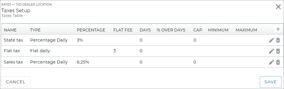If your location charges for rates, fuel, or incidentals, you may need to tax any of these items. Use the Taxes Setup management setting to define the taxes and surcharges (or flat fees) that apply to charges in your state/province, county, or municipality.
