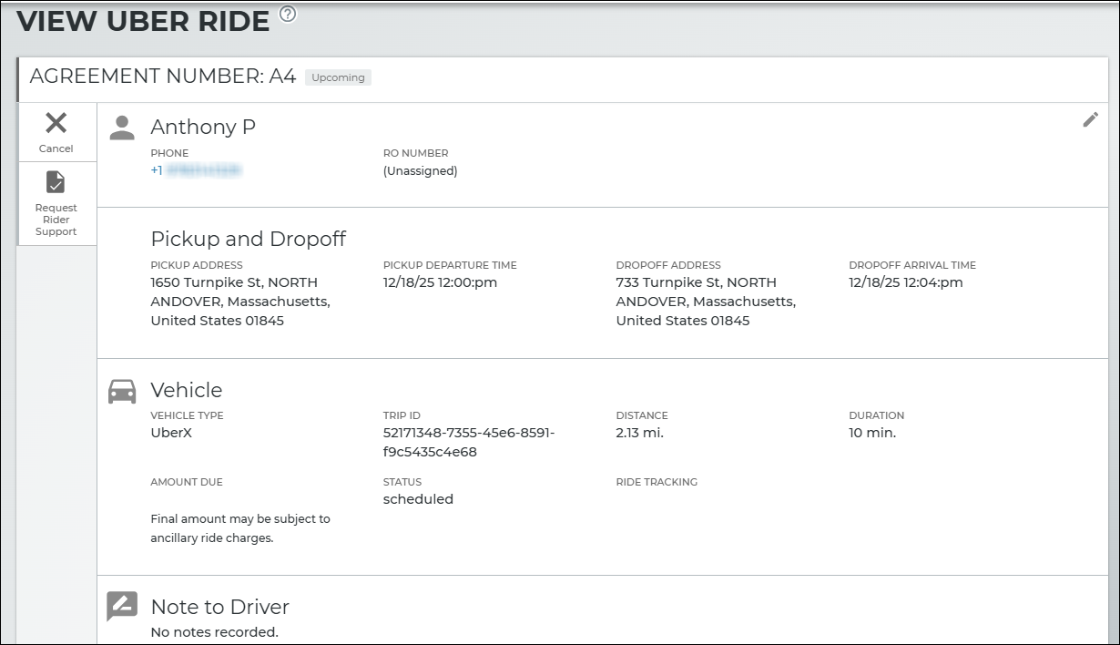 The Uber tab on your 'Home' screen is your place to view all Uber trips, including relevant information, such as Agreement Number associated with the trip and trip status.