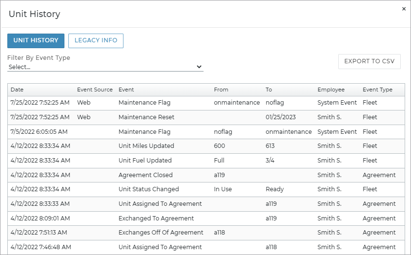Note: By default, your view is the Legacy version of unit events. Click the Unit History button to view the new version of events. Legacy information will not display history for units added to your fleet after August 1st, 2023. Since improvements will continue to be made to the Unit History dialog, the Legacy Info tab is available for you to access the previous version of Unit History, if necessary.