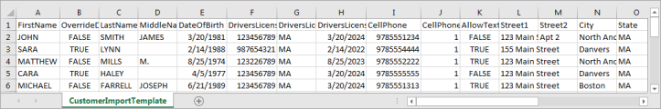 Click here to download a CSV template with field lengths, formatting guidelines, and examples included in the comments. All required fields have red, bold labels. See "Customer Import Requirements" for information on data requirements, such as field length and accepted values.