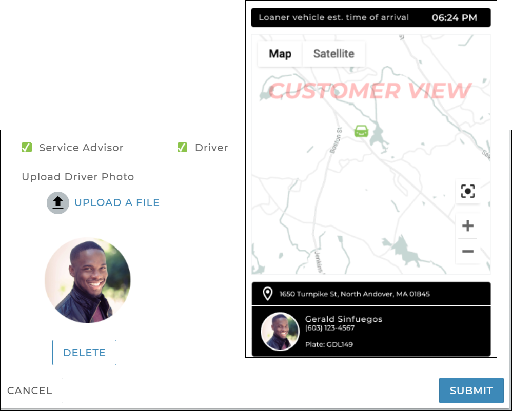 UPLOAD A FILE and select the image to upload. A preview is displayed, cropped as a circle. - Click . When a customer is tracking their delivery or collection driver, the image will be displayed next to the driver's name.