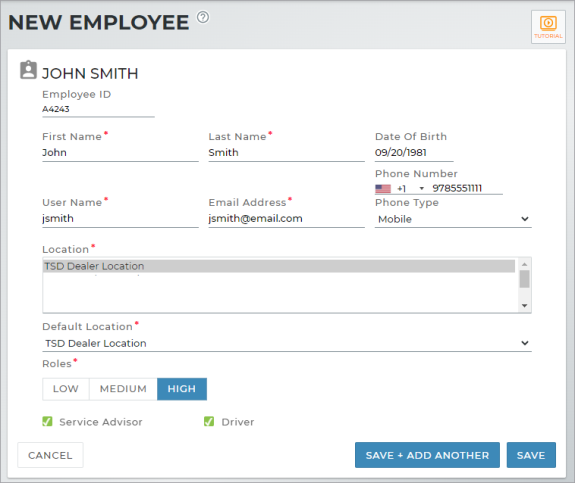 - (Optional.) Depending on the employee's job responsibilities, consider selecting the Service Advisor check box (to include the employee in Service Advisor lists on appointments and agreements) or Driver check box (to allow driving shuttle units on shuttle agreements or unit on Delivery and Collection agreements).